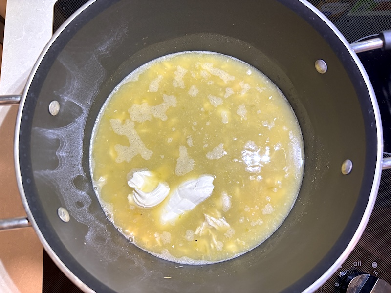Reduce the heat to low. Add the softened cream cheese to the pot. Keep stirring until the cream cheese has melted into the soup. Let the soup simmer on low until some of the liquid evaporates and the chili thickens a bit.