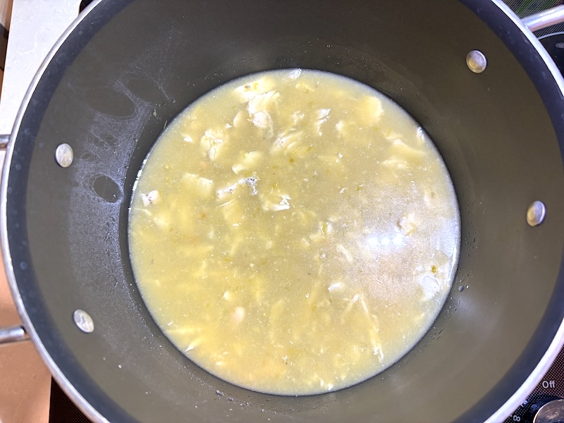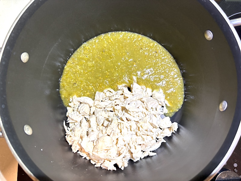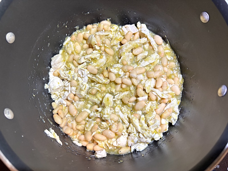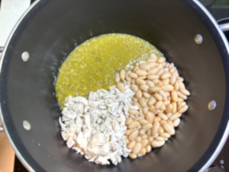 - Add ingredients to the pot: Add the cooked shredded chicken, white beans, salsa verde, and chicken broth to the saucepan or pot. Stir until combined.