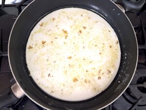 • Make the garlic cream sauce: In a large skillet, heat the olive oil over medium heat. Add the minced garlic and cook for 1–2 minutes, stirring frequently, until light brown and fragrant.