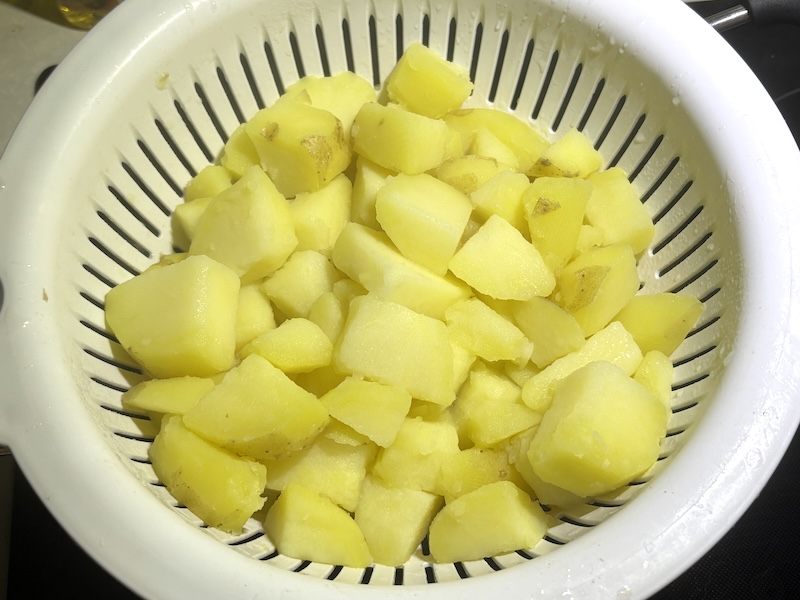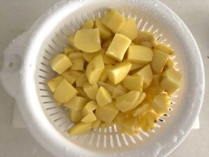 Dice the potatoes: Wash the potatoes in a strainer or colander. Peel the potatoes until most of the skin is off. I like to leave a bit of skin on since it gives a nice texture to the potatoes. Dice the potatoes into large chunks like above.