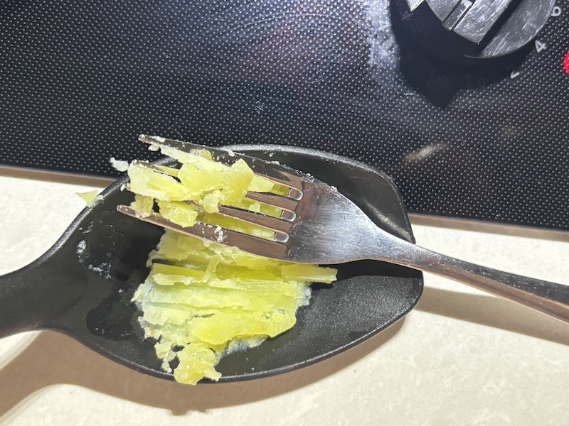The potatoes should be fork tender – meaning that they should mush up when you press on them with a fork (see bottom left photo above).