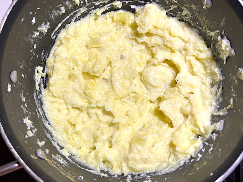 Mash the potatoes, cottage cheese, and melted butter together using a wooden spoon, potato masher, or immersion blender. Don’t overmix the potatoes! Mash them until they are smooth but still a little chunky like in the photo above.