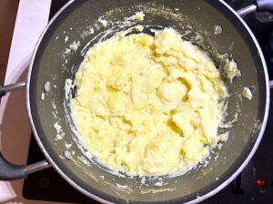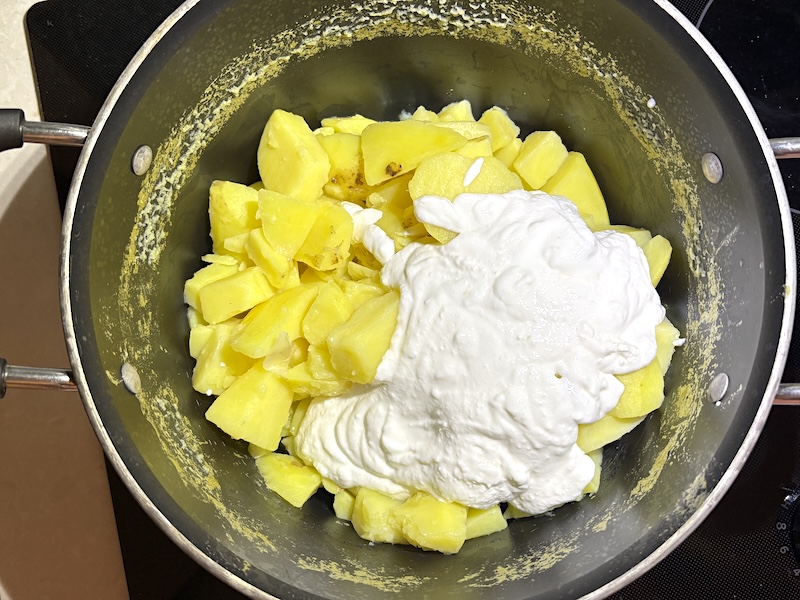 - Mash the potatoes. Add warm melted butter and blended cottage cheese on top of the warm potatoes.
