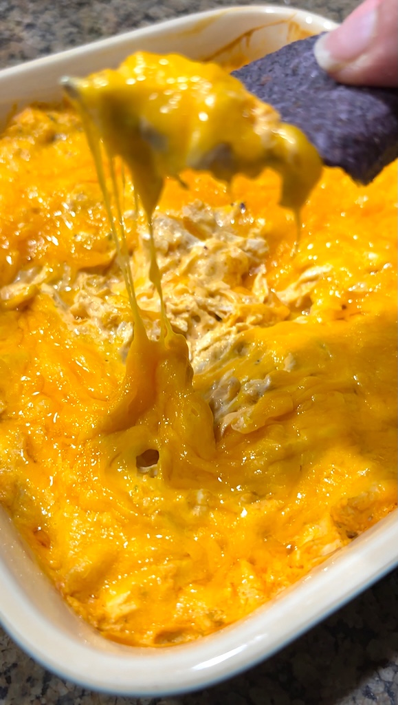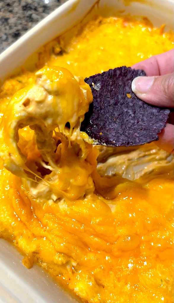 Let the dip cool for a few minutes and then dig in with some tortilla chips, celery, or carrot sticks!