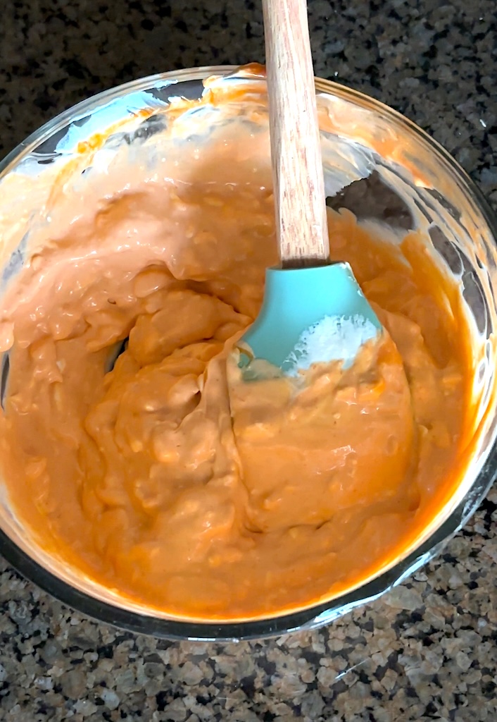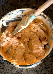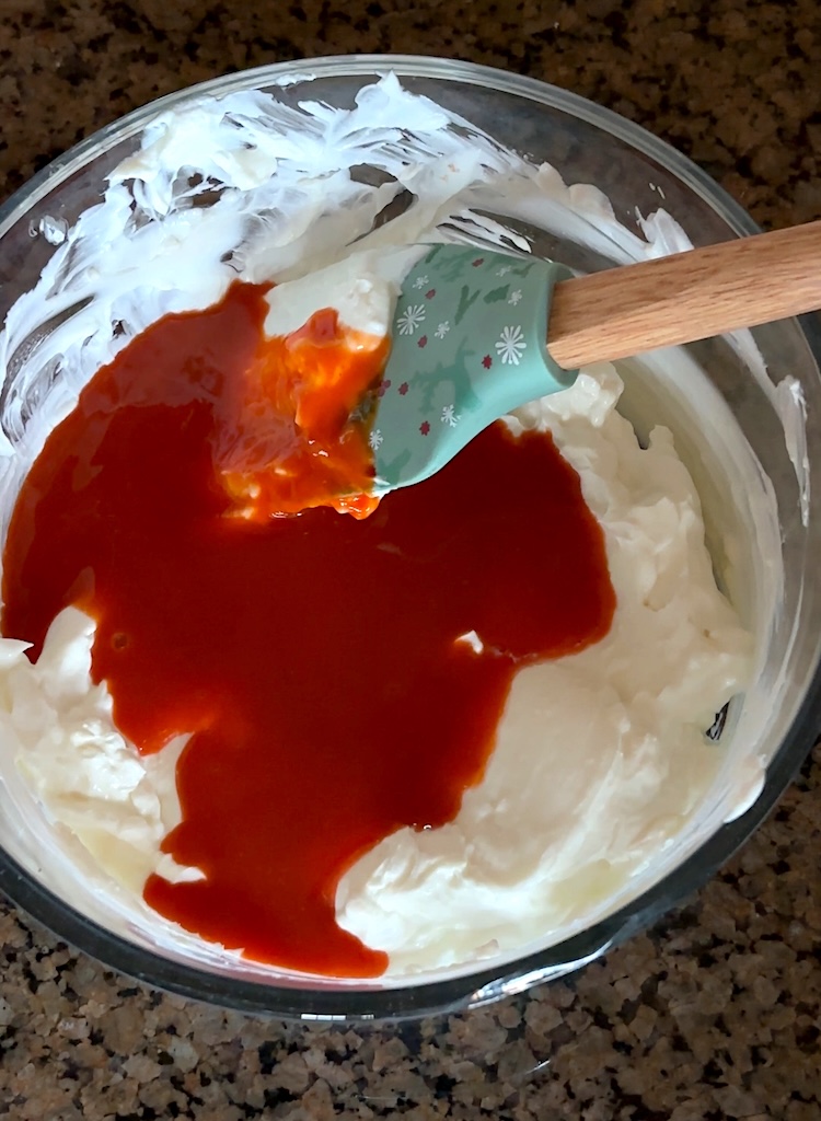 Add buffalo sauce to the mixing bowl. Mix together until it’s combined with the cream cheese and Greek yogurt. I used 1/2 cup which I found to be mild spicy and the perfect amount of buffalo flavor, but you can use more or less depending on your preference.