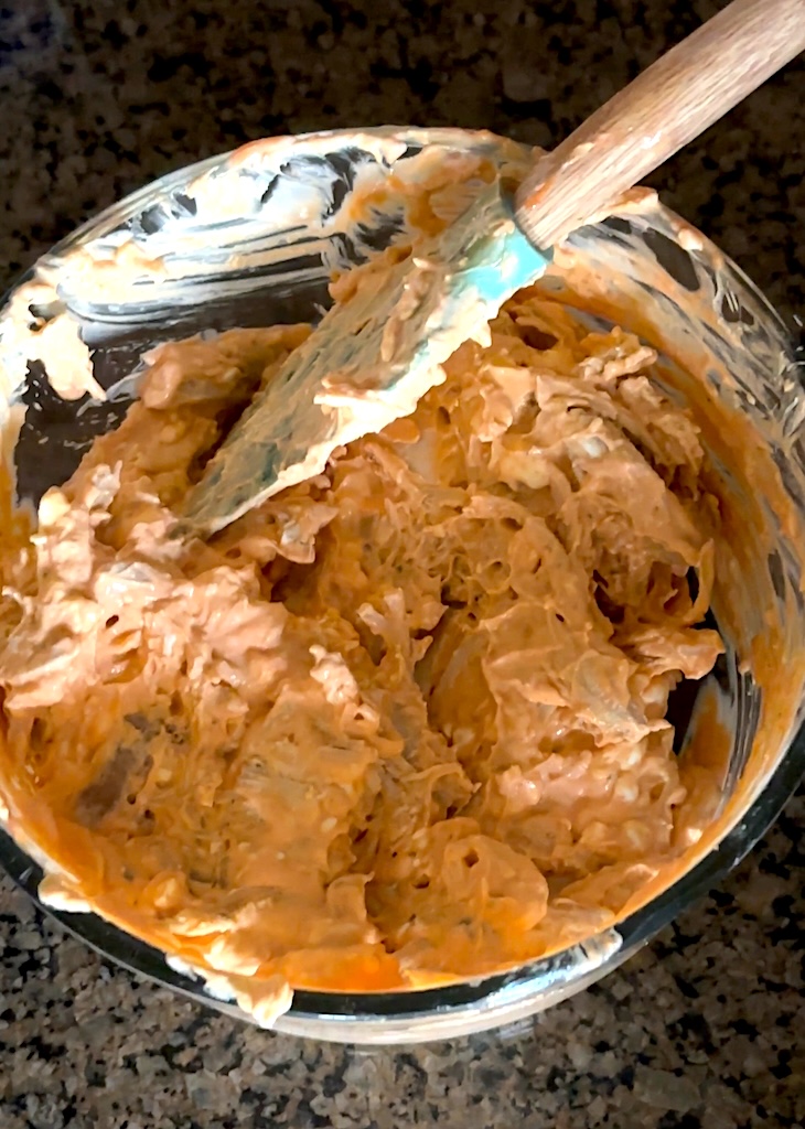 - Stir in buffalo sauce, and mix well to combine.