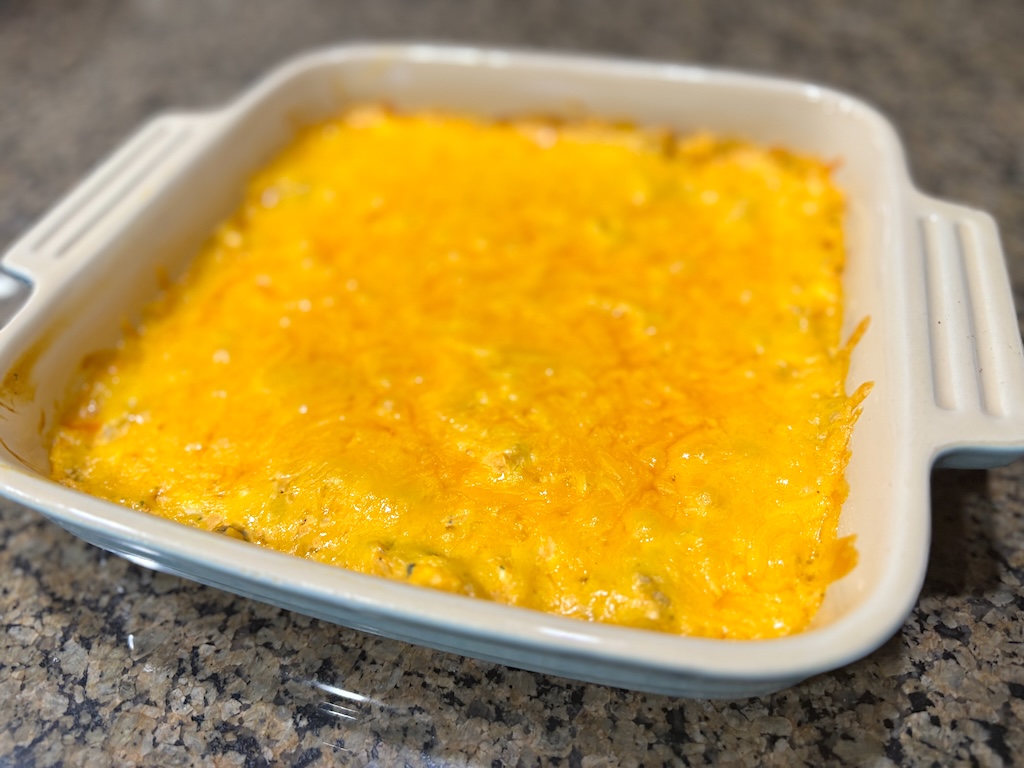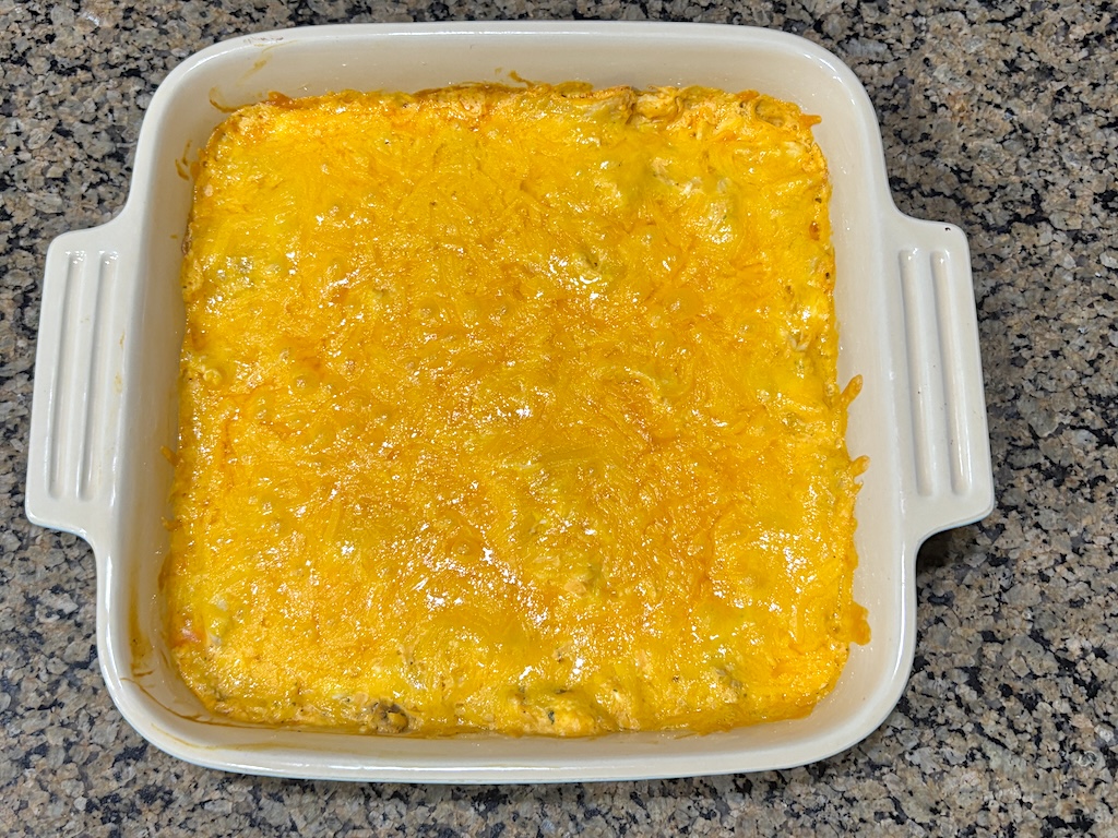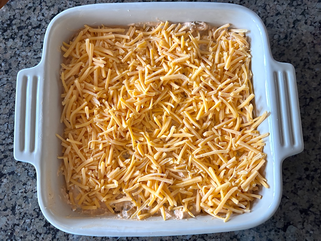 - Transfer the mixture into an 8×8 baking dish. Sprinkle shredded cheddar cheese evenly on top.