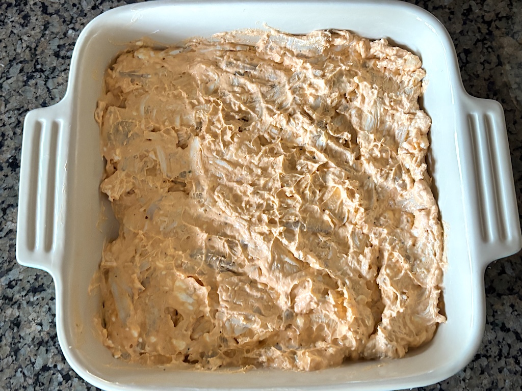Transfer the buffalo chicken dip mixture from the mixing bowl to a 8×8 baking dish. I didn’t grease my baking dish before pouring the mixture in and I didn’t have any trouble with the dip sticking!