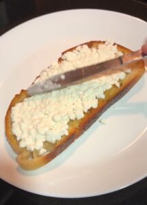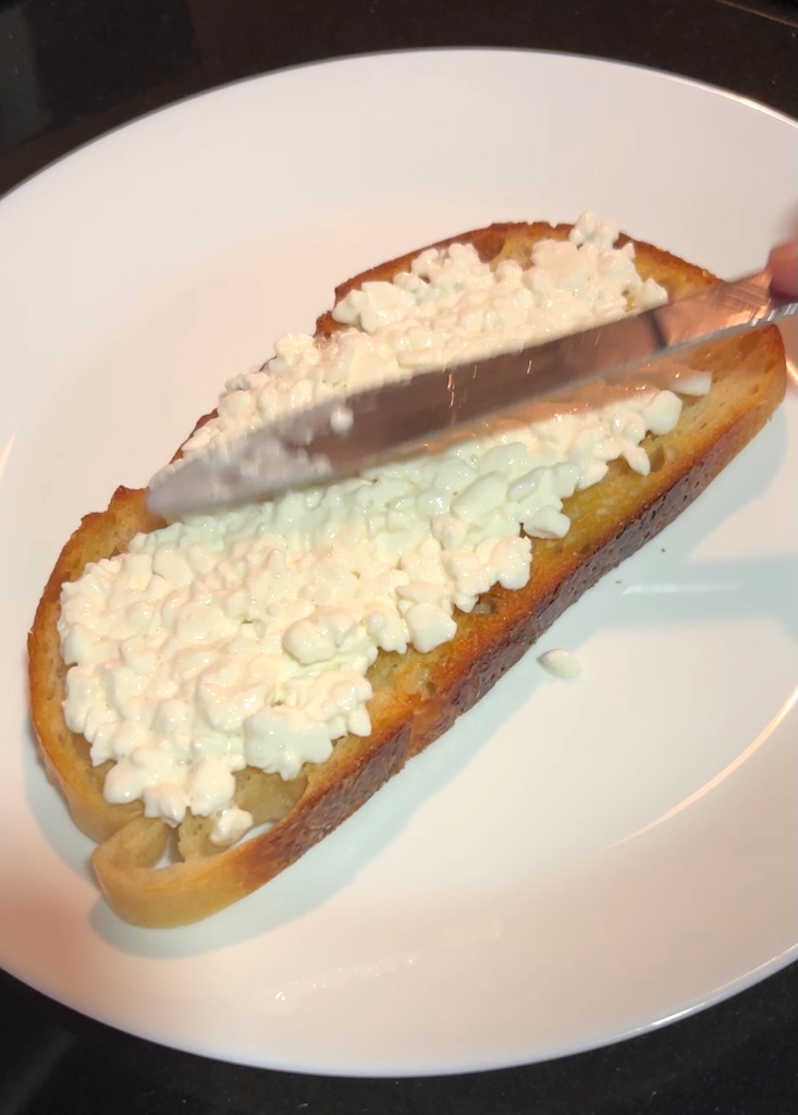 - Add cottage cheese on top of the bread. Spread evenly across the bread using a knife. I used ⅓ cup of cottage cheese, but you can use more or less depending on your preference.