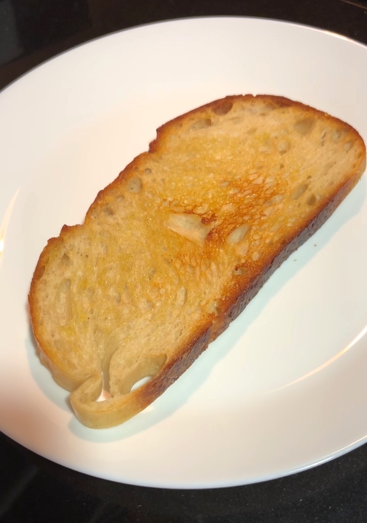 This step is optional, but I recommend toasting your slice of bread if you have a couple of extra minutes. I like to toast mine on the skillet with a drizzle of olive oil, but you can also pop it in the toaster for a few minutes on low setting.